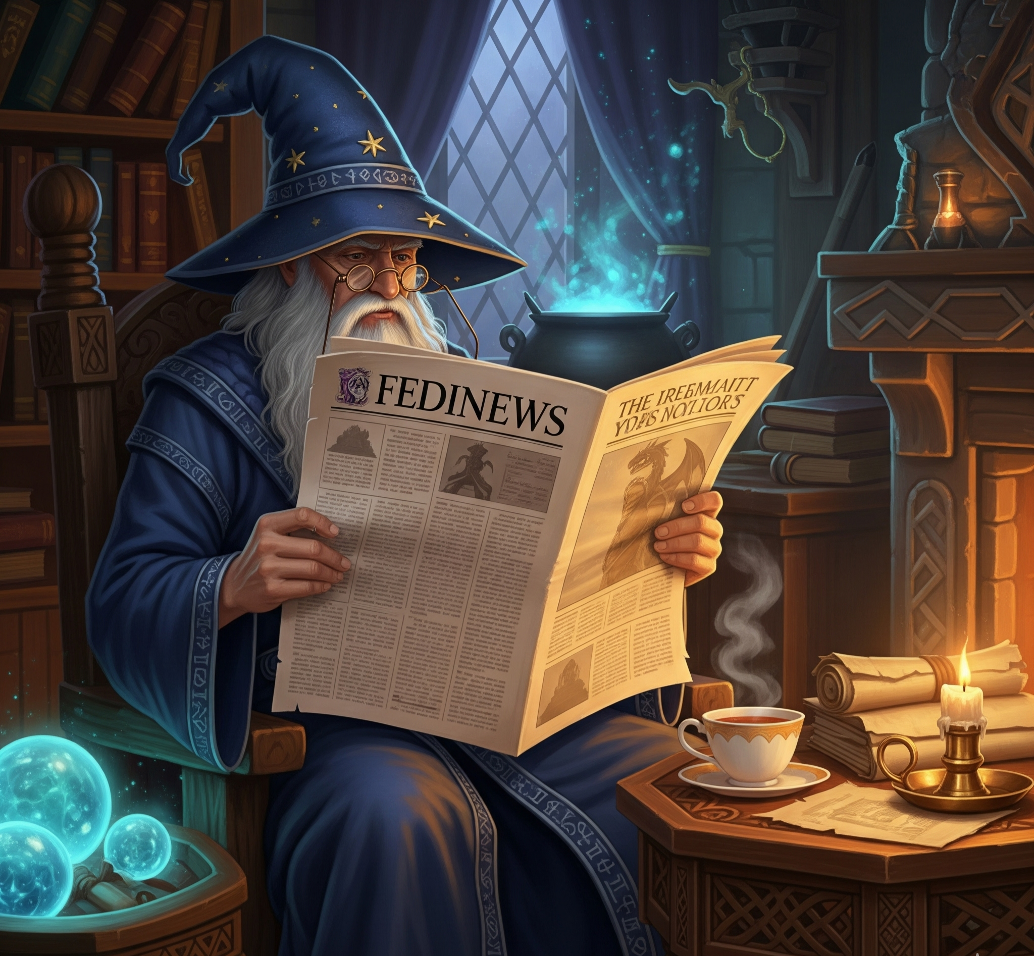 @MDT Una persona con cabello y barba blancos, vestida con un sombrero azul de mago adornado con estrellas y runas, una túnica azul con detalles decorativos y gafas redondas, está sentada en una silla de madera leyendo un periódico. La página izquierda del periódico muestra el titular "FEDINews" y la página derecha muestra "THE IREMEANIT YODS NOLTORS", con múltiples columnas de texto y una ilustración de un dragón. El escenario es un estudio mágico con una estantería llena de libros, un caldero que emite humo azul sobre un hogar de piedra y una pequeña mesa de madera que sostiene una taza de té humeante, pergaminos enrollados y una vela encendida en un soporte de latón. A la izquierda, una mesa redonda contiene orbes azules brillantes, mientras que el fondo incluye una ventana con un patrón de diamantes y cortinas oscuras, y paredes de piedra tallada. La luz cálida de las velas y el brillo azul de los orbes y el humo del caldero crean un ambiente acogedor y místico.Proporcionado por @altbot, generado de forma privada y local usando Qwen3-Vl:8b Energía utilizada: 0.439 Wh